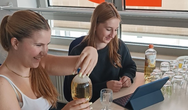 Ein besonderes Highlight der Stationsarbeit war eine etwas ungewöhnliche, aber sehr einprägsame Übung: Anhand von Apfelschorle sollten die Schüler:innen beobachten, wie sich Urin hinsichtlich Farbe, Geruch und Klarheit beurteilen lässt. Diese alltagsnahe Simulation sorgte nicht nur für viele Aha-Momente, sondern auch für einige Schmunzler – und zeigte auf humorvolle Weise, wie wichtig genaue Beobachtung in der Pflege sein kann.