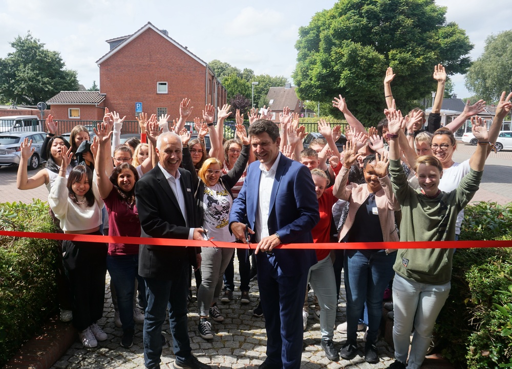 Standortleiter Jan van der Meer und Schulleiter Guido Brüggen haben gemeinsam mit den Schüler:innen des ersten Ausbildungsjahrgangs Pflegefachfrau/Pflegefachmann das rote Band zerschnitten und den neuen Standort feierlich eingeweiht.