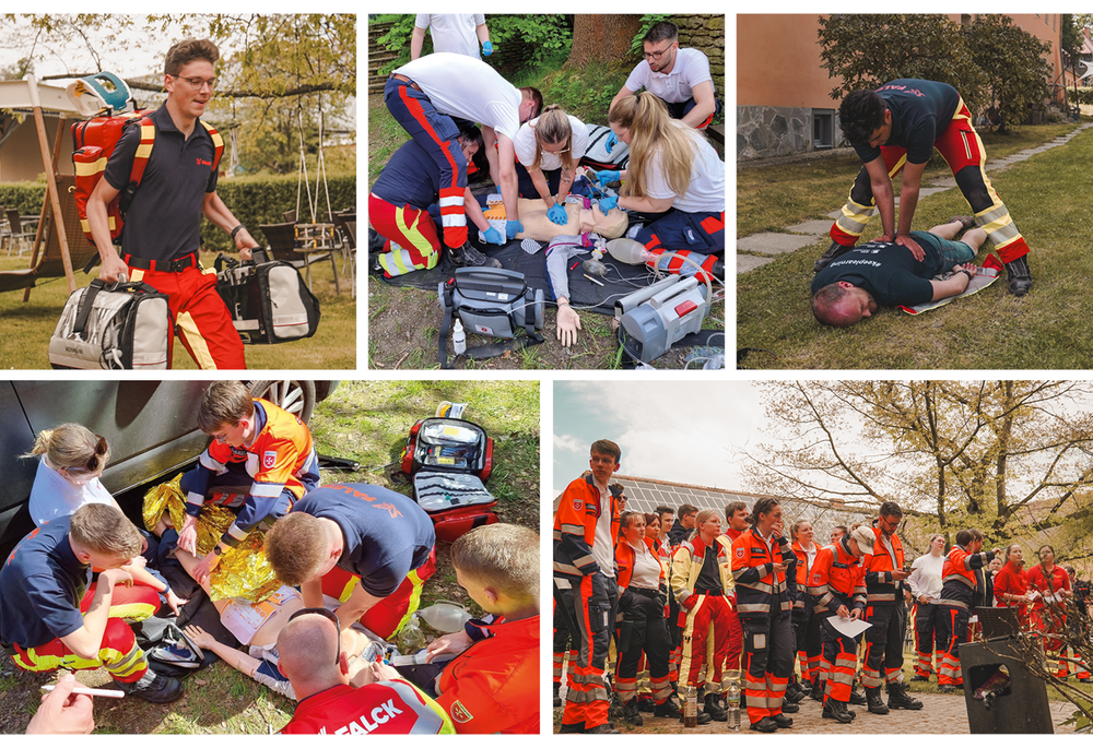 Die Lehrkräfte vor Ort erhielten tatkräftige Unterstützung von Praxisanleiter:innen der Kooperationspartner Malteser Hilfsdienst gGmbH, ASB Rettungsdienst gGmbH (Neustadt in Sachsen) sowie Falck Notfallrettung und Krankentransport GmbH. Besonders erfreulich war die Unterstützung ehemaliger Schüler:innen, die sich freiwillig als Darsteller und Dozenten engagierten. Sie agierten als Stationsleitung und Mimen, achteten genau auf die Durchführung der Tätigkeiten und bewerteten diese.