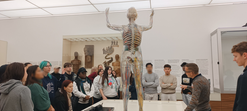 In einer spannenden Führung erhielten wir beeindruckende Einblicke in das Wunderwerk des menschlichen Körpers. Wusstet ihr, dass die Blutgefäße eines Menschen die Erde zweimal umspannen könnten? Oder dass der Herzschlag schon am 21. Tag des Lebens einsetzt? Für die angehenden Pflegekräfte schaffen solche Einblicke ein tiefes Verständnis für die Prozesse im menschlichen Körper, das sie in ihrem zukünftigen Beruf nutzen können.