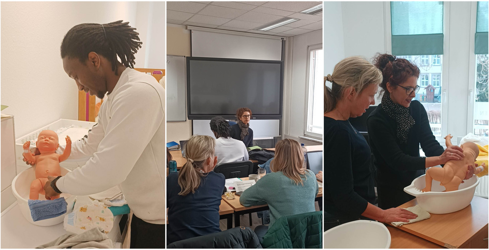 Da das kooperierende Krankenhaus besonderen Wert auf die Fähigkeit legt, ein professionelles Säuglingsbad durchzuführen, wurde diese Unterrichtseinheit gezielt wiederholt. In unserem speziell eingerichteten Kinderpflegezimmer konnten die Schüler:innen unter Anleitung an unseren realistischen Übungspuppen die notwendigen Handgriffe erlernen und verfeinern. Doch es ging nicht nur um die Technik – mindestens genauso wichtig ist die Kommunikation mit den Eltern. Viele Mütter und Väter fühlen sich unsicher im Umgang mit ihrem Neugeborenen, weshalb einfühlsame Begleitung und gezielte Anleitung essenziell sind. Hier konnten unsere Schüler:innen nicht nur fachliches Wissen anwenden, sondern auch ihr Feingefühl und ihre Empathie stärken.